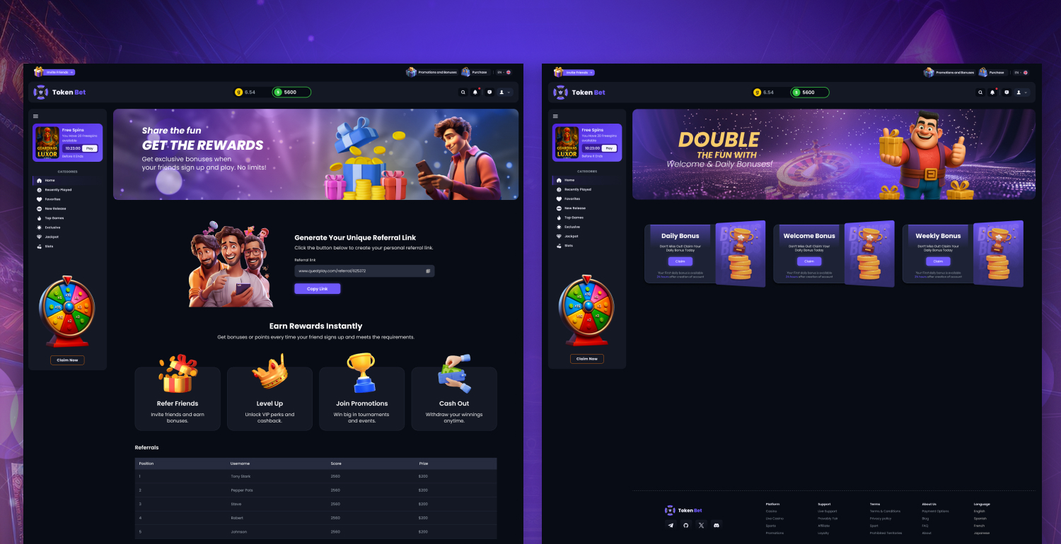 Casino is an online gaming platform designed to deliver a seamless and engaging betting experience. The project focused on creating a visually striking, user-friendly interface with intuitive navigation for easy access to games, promotions, and secure cryptocurrency transactions.